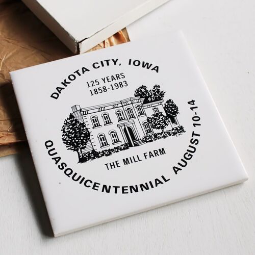 USAヴィンテージ雑貨の陶器製THE MILL FARM125周年記念タイルです。アメリカンアンティーク雑貨やヴィンテージ雑貨で人気の高いアニバーサリータイル。こちらはアメリカのアイオワ州ダコタにあるTHE MILL FARM歴史博物館が1983年につくった125周年を祝うタイ…